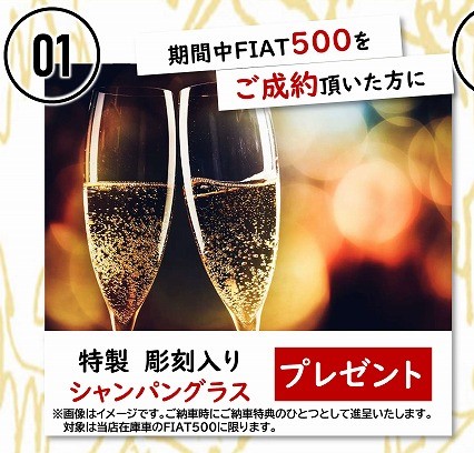 当店在庫車のFIAT500をご成約頂いた方に、当店でお車をご成約頂いた方には通常スパークリングワインをプレゼントさせて頂いていますが、それとセットで『シャンパングラス』をプレゼントさせて頂きます。