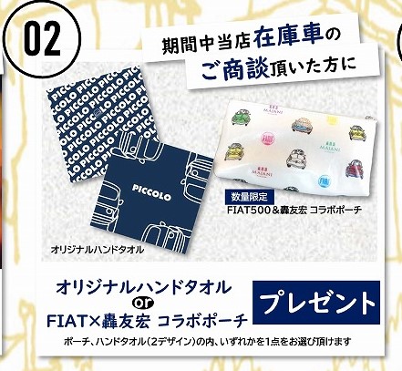 当店在庫車をご商談頂いた方に、当店オリジナルハンドタオルもしくはFIAT×轟友宏 ポーチをプレゼント致します。